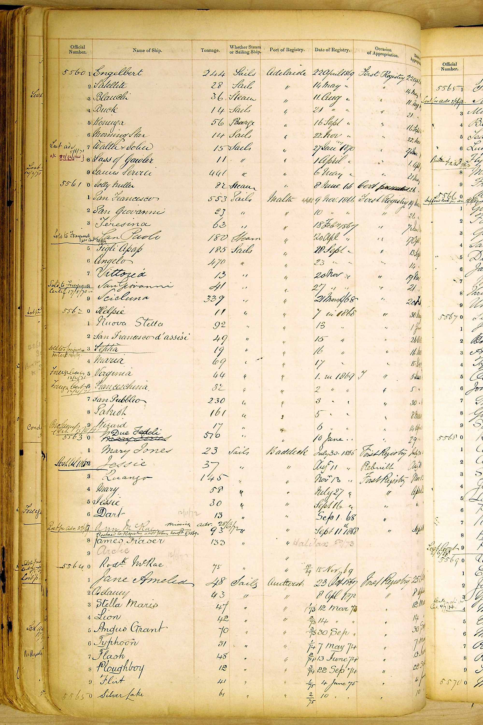 Especially in the first volume, there are frequent margin annotations against the entries which (if you can decipher them) can provide information on the ultimate fate of the ship. Typical entries are 'Lost as per cert[ificate] 20/6/58' or 'Sold foreigners per advice 8/4/67'. Beware - it is sometimes not easy to see which entry it refers to. However, these annotations may be a useful quick alternative to consulting the original Shipping Registers.