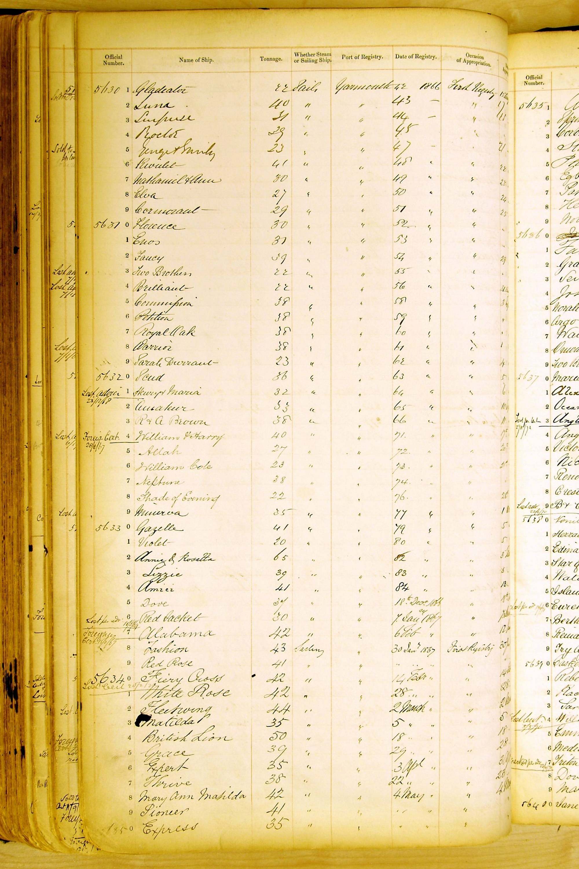 Especially in the first volume, there are frequent margin annotations against the entries which (if you can decipher them) can provide information on the ultimate fate of the ship. Typical entries are 'Lost as per cert[ificate] 20/6/58' or 'Sold foreigners per advice 8/4/67'. Beware - it is sometimes not easy to see which entry it refers to. However, these annotations may be a useful quick alternative to consulting the original Shipping Registers.