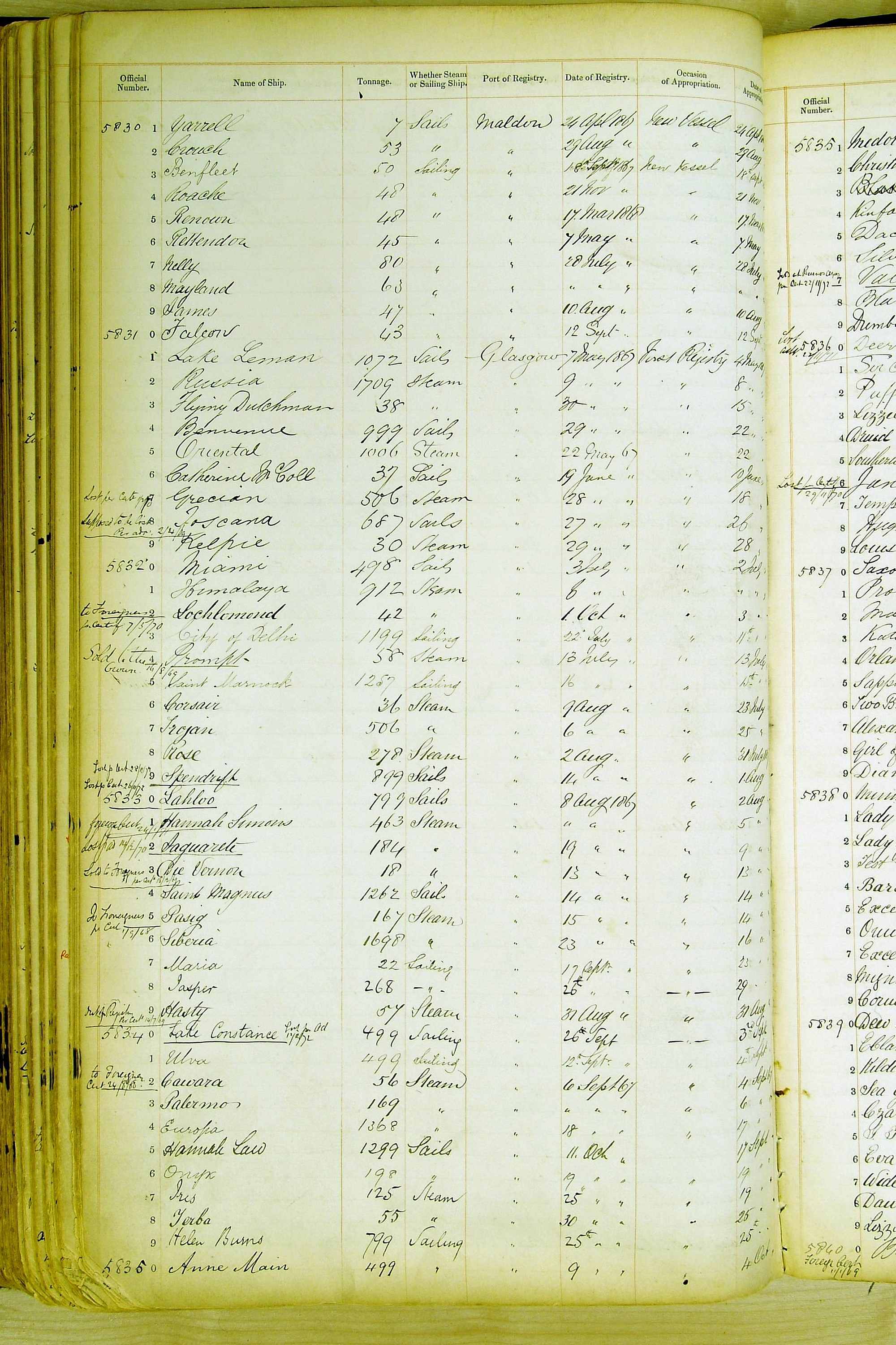 The ship names recorded are those that the ships carried at the time that their official numbers were allocated - changes are sometimes noted, but the best source for changes of name are the shipping registers for the port, or alternatively the Mercantile Navy List.