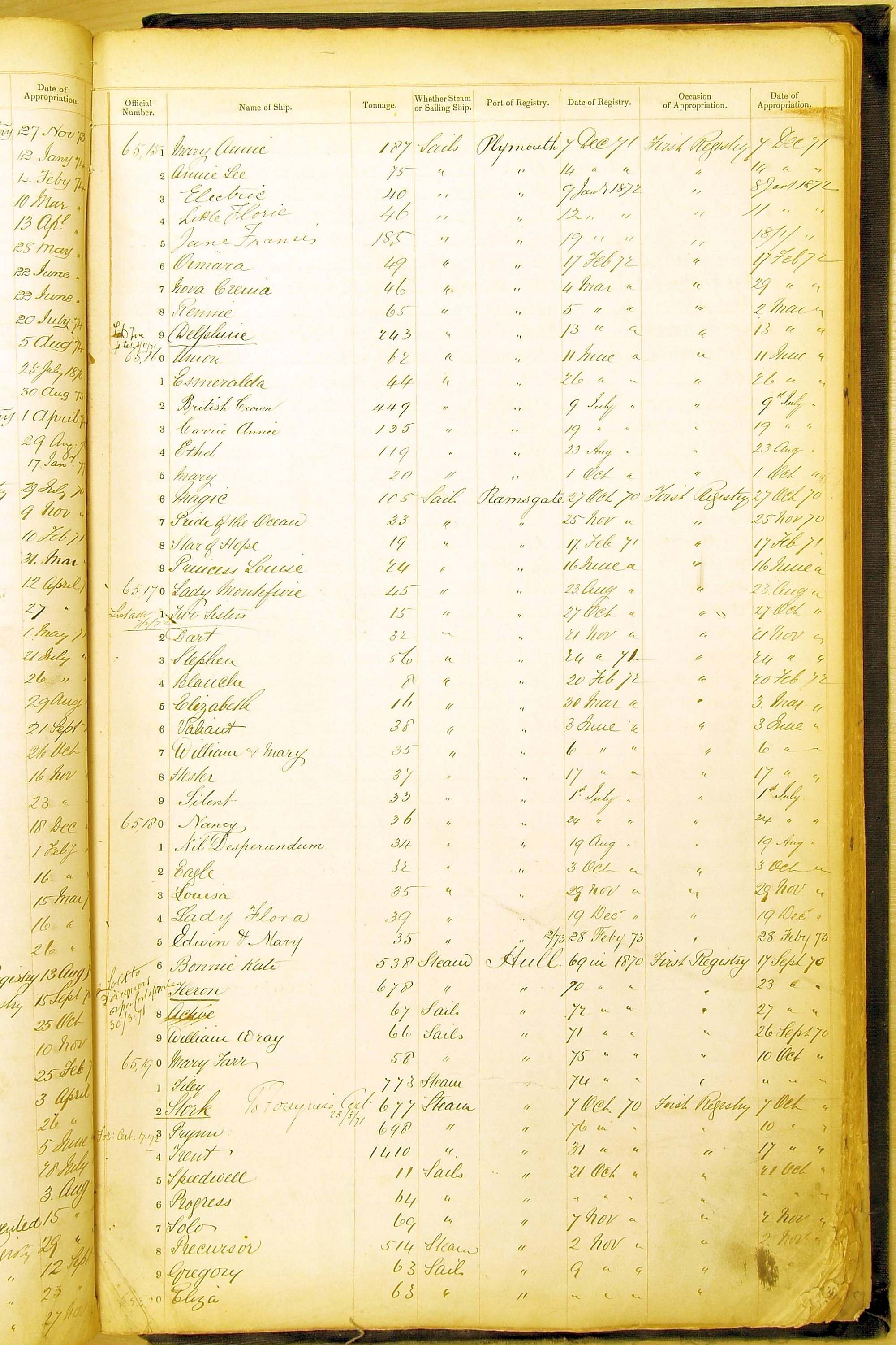 Bear in mind that the ships names in the Appropriation Books are not the definitive name or spelling of the name, even though these are the central records for the whole system. As you can see, the entries are hand-written and derived from hand-written returns made by the various ports, themselves based on the hand-written shipping registers, based on what the port officials thought the person registering the ship was saying or had hand-written down.