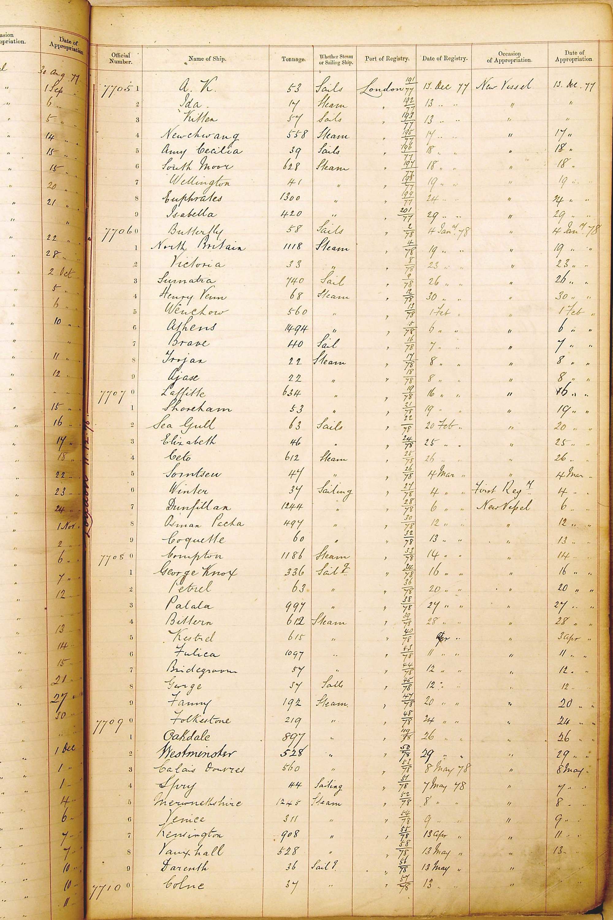 The ship names recorded are those that the ships carried at the time that their official numbers were allocated - changes are sometimes noted, but the best source for changes of name are the shipping registers for the port, or alternatively the Mercantile Navy List.