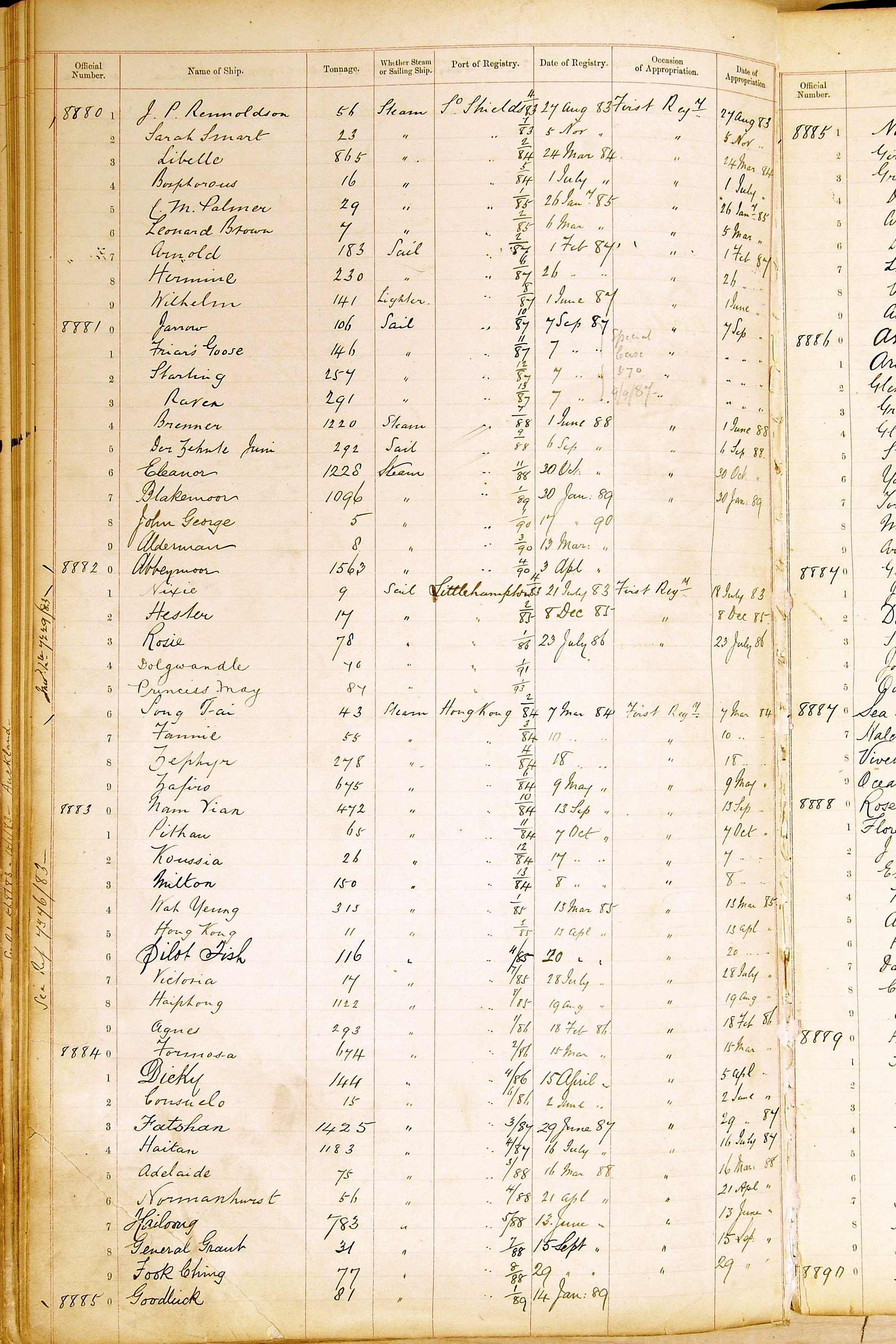 The ship names recorded are those that the ships carried at the time that their official numbers were allocated - changes are sometimes noted, but the best source for changes of name are the shipping registers for the port, or alternatively the Mercantile Navy List.