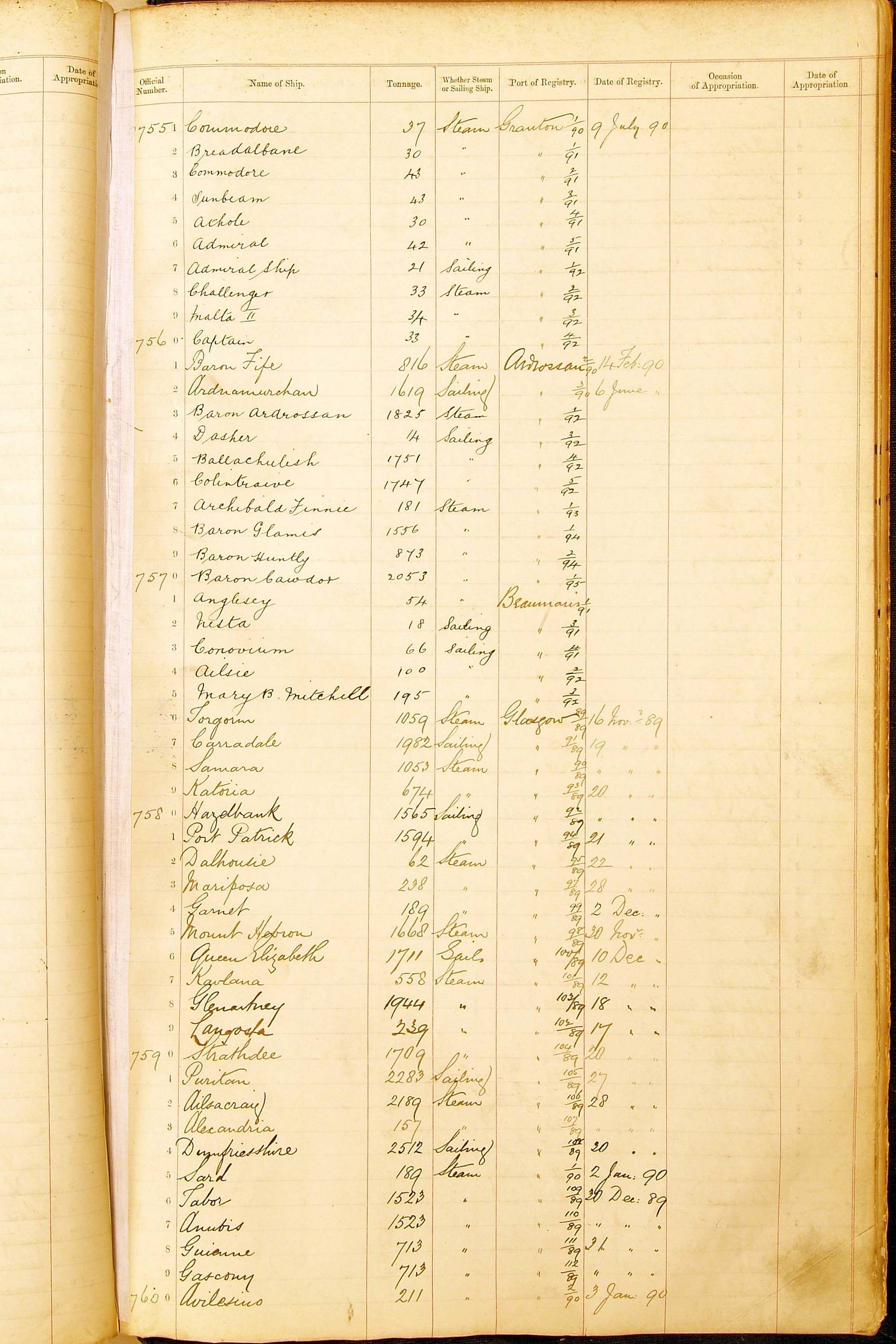 Bear in mind that the ships names in the Appropriation Books are not the definitive name or spelling of the name, even though these are the central records for the whole system. As you can see, the entries are hand-written and derived from hand-written returns made by the various ports, themselves based on the hand-written shipping registers, based on what the port officials thought the person registering the ship was saying or had hand-written down.